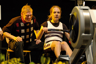 Endspurt bei den internationalen NRW-Meisterschaften am Ruder-Ergometer in Essen-Kettwig: Von ihrem Trainer Guido Höltke angefeuert "fährt" Dorthe Kayser für den Bessel-Ruder-Club den ersten Landestitel der Saison ein. Foto: pr