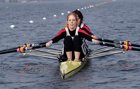 Dorthe Kayser und Vanessa Mohme (vl) erruderten bei den deutschen Jugendmeisterschaften in Duisburg für den Bessel-Ruder-Club den vierten Rang im leichten Juniorinnen-B-Zweier.